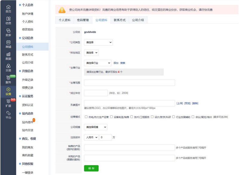 上邊那一行—— 公司資料 | 聯(lián)系方式 | 公司介紹 ——這三個(gè)標(biāo)簽挨個(gè)點(diǎn)擊填完吧!