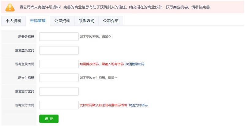 本著資料填寫(xiě)的重要性,用戶的“公司資料”和“個(gè)人資料”標(biāo)簽填寫(xiě)或修改完畢后,系統(tǒng)都會(huì)跳轉(zhuǎn)到“密碼管理”確認(rèn)頁(yè)面。