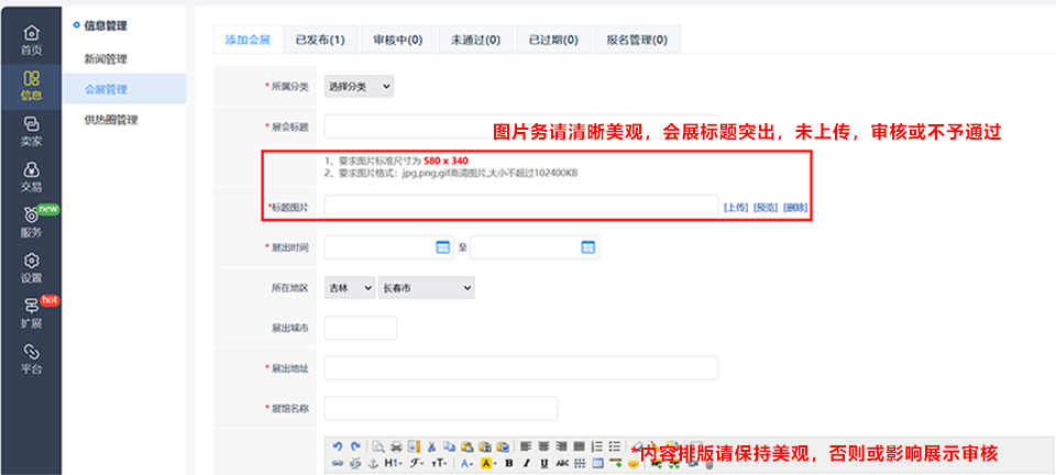 五、為規(guī)范信息發(fā)布,信息發(fā)布后的狀態(tài)為待審,經(jīng)本站審核后,才能予以在會展頻道展示。