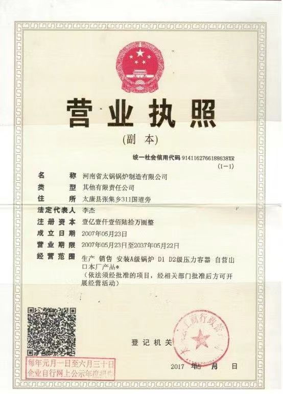 證書介紹 河南省太康鍋爐廠始建于1976年,是國家市場監(jiān)督管理總局定點A級鍋爐制造A2級壓力容器制造的大型現(xiàn)代化企業(yè),具有40多年的鍋爐壓力容器設計制造經(jīng)驗,主要產(chǎn)品有燃煤鍋爐、生物質(zhì)鍋爐、燃油鍋爐、燃氣鍋爐、甲醇鍋爐、電加熱鍋爐、有機熱載體鍋爐(導熱油爐)、熱風爐、煤礦熱風爐、蒸汽鍋爐、蒸汽發(fā)生器、熱水鍋爐、循環(huán)流化床鍋爐、工業(yè)鍋爐、電站鍋爐、生活鍋爐、低氮鍋爐(執(zhí)行30毫克/立方米以下)、冷凝式鍋爐、真空鍋爐、蒸壓釜、滅菌鍋、食品機械、木材阻燃防腐設備、壓力容器。