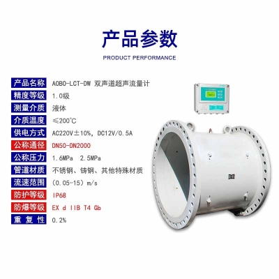 濰坊奧博管段式超聲流量計(jì)DN25-DN2000過檢測(cè)LCT超聲流量計(jì)采用時(shí)差法計(jì)算流量,利用微處理數(shù)字技術(shù),特別適用于區(qū)域供熱,熱源廠,換熱站,暖通空調(diào)(空調(diào)制冷設(shè)備)、自來水等液體的流量測(cè)量。